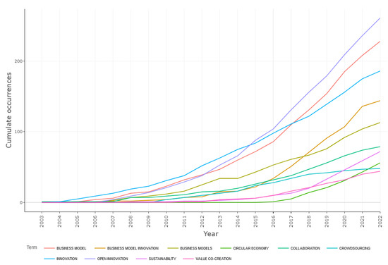 The analysis of the development and current structure of research themes in the BM&OI literature started with the analysis of the authors’ most frequent keywords and the structure of the links between them. The analysis of the keywords indicated the main research themes in the field of study. Figure 3 presents the dynamics of the increment in the number of occurrences of the 10 most frequent keywords appearing in the time period of 2003–2022. It follows from the analysis that the most frequent keywords were related to the main research areas and included open innovation, business model/business models, and business model innovation. They appeared at the beginning of research concerning the period and the number of their occurrences rose continuously. The other words, including collaboration and crowdsourcing, appeared a bit later. The latest to observe was the increase in interest in aspects concerning value co-creation, sustainability and circular economy.