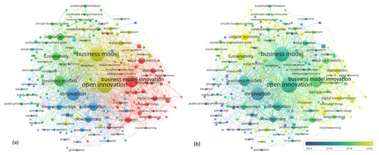 The results of the co-occurrence of authors’ keywords analyzed over time, shown in Figure 4b, indicated that as the research on the BM&OI developed, the research themes were enriched with additional and important economic and societal aspects. The keywords that appeared later on include first of all the ones related to sustainable development (sustainability, sustainable development, sustainable business model), ecological challenges (circular economy, circular business models, bioeconomy), the development of digitalization and of the ICT and the smart city concept (digital transformation, digitalization, blockchain, artificial intelligence, smart cities, IoT) and the onset of the COVID-19 pandemic (COVID-19).