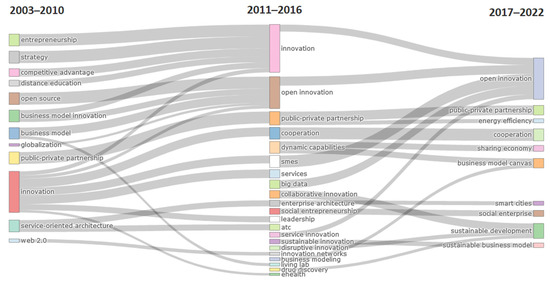 The results presented in Figure 5 indicated that during the first analyzed period (2003–2010) the researchers focused primarily on issues such as innovation, open source, business model, strategy, entrepreneurship, public–private partnership and service-oriented architecture. With time, some of the themes evolved, e.g., open source, business model innovation, innovation, business model into open innovation; web2.0 into innovation networks, or sustainable and collaborative innovation into sustainable development. Others emerged, e.g., dynamics capabilities, big data, or sustainable innovation. It should also be noted that such now-vital themes as energy efficiency, sustainable development or smart cities gradually became important research themes of the BM&OI literature.