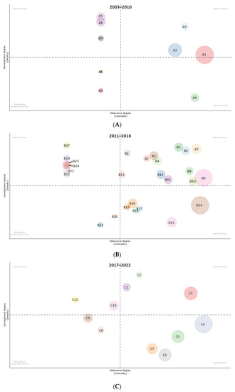 In the next stage, the thematic evolution of the research undertaken in the periods under consideration was expanded by creating the thematic maps for each relevant period. The outcome of this analysis is illustrated in Figure 6, and Table A2 presents the most important characteristics of identified clusters.
