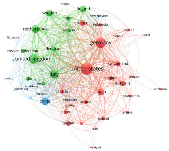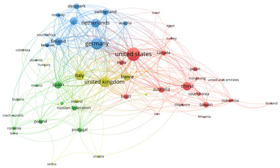 The next step was to carry out network analyses aiming at mapping the geographical scientific collaboration of countries using the co-authorship and citation networks. Further analyses conducted after that concerned the mapping of the scientific collaboration of sources using the citation and co-citation networks, and bibliographic coupling network of documents. The network analyses performed in the VOSviewer are perfectly suited for visualization of network relationships between elements [98]. The nodes are represented depending on the type of the analysis subject by keywords, sources, or countries. Each of the network elements is assigned to a cluster represented by a different color. The clustering technique used by this program is based on the smart local moving algorithm introduced by Waltman, Van Eck, and Noyons [100,101]. The relationships (e.g., co-occurrence, co-citation) between them are represented by lines. The size of the circles obtained from the analysis corresponds to the frequency of the co-occurrence or the number of occurrences of a given element in the network (it can represent the number of the occurrences of a keyword, the number of publications, the number of citations). The higher the number, the bigger the circles and vice versa. The location of the circles in relation to each other is the effect of the strength (number) of links between them. The bigger the strength, the closer the circles are to each other.