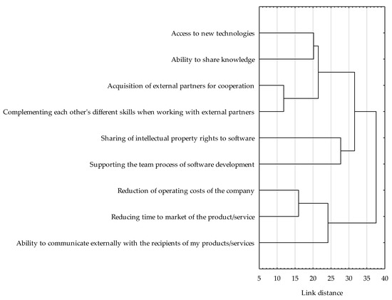 Based on the results of the cluster analysis using the agglomerative method, similarities were found in terms of the degree of motivation for the use of open innovation platforms and/or networks for factors such as access to new technologies, the ability to share knowledge, acquisition of external collaboration partners, and complementing each other’s different skills when working with external partners. A two-component cluster consisting of motivating factors in the form of sharing software intellectual property rights and support for the collaborative software development process was also noted. In addition, the above analysis showed that the following factors were of similar importance in motivating the use of open innovation platforms and/or networks for the respondents: reducing the cost of operating the company, reducing the time to market of the product and/or service, and the ability to communicate externally with the recipients of the products and/or services (Figure 1).