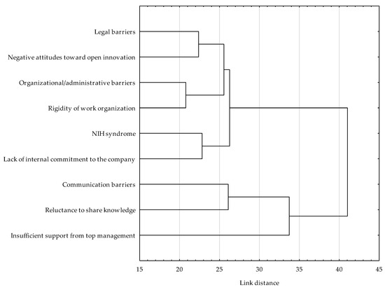 As cluster analysis using the agglomerative method showed, the individual factors representing barriers to the use of open innovation platforms and/or networks for respondents fell into two clusters. It turned out that obstructions such as legal barriers, negative attitudes toward open innovation, organizational and/or administrative barriers, rigidity of work organization, NIH syndrome and lack of internal commitment to the company were rated similarly. In addition, there were similarities in evaluations of factors such as communication barriers, reluctance to share knowledge, and insufficient support from top management (Figure 2).