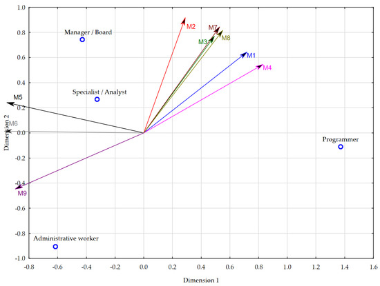 The final step in building a model on the motivating factors for the use of platforms and/or open innovation networks in different professional groups was a PROFIT analysis, and the result is shown in the chart below (Figure 3). The model developed showed that managers and management and specialists and analysts using platforms and/or open innovation networks were driven by the greatest number of motivating factors, with the latter group being slightly more important. This was especially true in terms of lowering the company’s operating costs (M5) and reducing the time to market a product and/or service to market (M6), but also of relatively high importance to both groups (with specialists and analysts also more important) were factors such as the opportunity to share knowledge (M2), sharing intellectual property rights to software (M3), acquisition external collaboration partners (M7) and complementing each other’s different skills when working with external partners (M8). The latter four factors definitely did not motivate the use of platforms and/or open innovation networks of administrative staff, for whom the ability to communicate externally with the recipients of products and/or services was much more important (M9). Programmers, on the other hand, were most motivated to use the aforementioned solutions by access to new technologies (M1) and support for the team software development process (M4), but given the placement of this group in relation to the coordinates of the directional coefficients M1 and M4, it should be borne in mind that the importance of both of these factors in the context of programmers’ use of open innovation platforms and/or networks was not relatively high.