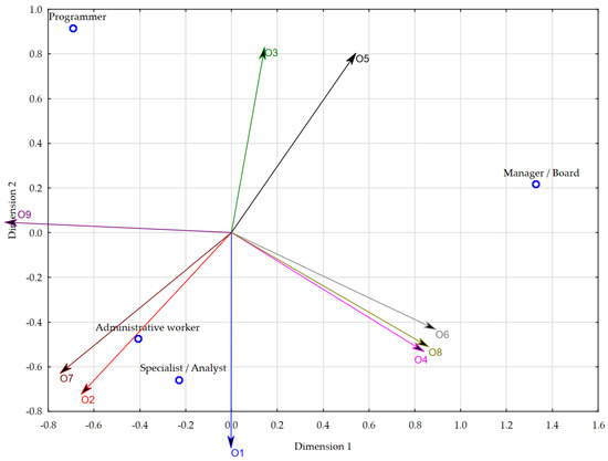 Finally, in order to build a model on the motivating factors for the use of platforms and/or open innovation networks among different professional groups, a PROFIT analysis was conducted, and the result is shown below (Figure 4). The model thus developed showed that for administrative employees, organizational and administrative barriers (O2) were a particular obstacle to the use of platforms and/or open innovation networks. This factor was a relatively large disadvantage for specialists and analysts as well. In addition, both groups (administrative employees and specialists and analysts) faced significant obstacles in the form of rigidity of work organization (O7) and legal barriers (O1). For programmers, the biggest obstacles were communication barriers (O3) and insufficient support from top management (O9). The latter factor, for obvious reasons, was decidedly not an obstacle for managers and the board of directors, while in this group the bigger obstacles to using open innovation platforms and/or networks were factors such as reluctance to share knowledge (O5), NIH syndrome (O6), lack of internal commitment to the company (O8) and negative attitudes toward open innovation (O4).
