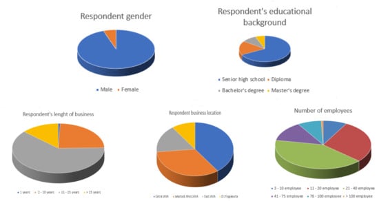 Based on Figure 2. respondents who comprised the final sample of this study were mostly male and the highest level of education obtained was senior high school. This is likely because some senior high schools in Indonesia have vocational lessons, namely, in business development. The length of business of the respondents varied, ranging from one year to over 15 years; however, the sample data show that the length of business of the respondents who dominate this research was between 11–15 years. All businesses run by these respondents held varying numbers of employees, ranging from 3 to over 100 employees; however, in this research sample, the average number of employees managed by respondents was between 21–40 employees.