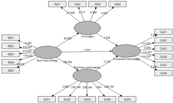 Business strategy has a positive and significant influence on innovation. This finding is supported by the value of the t count > t table (36.505 > 1.975), and a path coefficient of 0.024. This coefficient shows a significant positive relationship between business strategy and innovation. Companies that are adaptive and easy to adapt to changing industrial conditions by innovating can certainly compete with other competitors, so that innovation is part of an organization’s business strategy when it wants to continue to compete and exist in its industry in the long term [79]. The right business strategy can provide a wider scope for producing products or services that are more valued and considered unique than other competing companies. In addition, a good business strategy must be correct, which is also influenced by the existence of accurate information about the situation and condition of the company. This finding supports those of previous studies [80]. Thus, H2 is accepted.