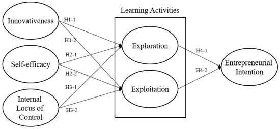 Existing research suggests that learning about and direct and indirect experience with participating in starting a start-up can affect start-up initiatives [4]. To specify the learning behaviors needed from entrepreneurs, organizational learning theory is adopted to explain organizational learning activities for advancing firms’ innovative performance. Organizational learning theory specifies the process of searching for, identifying, and exploring knowledge that is external to the company, called exploration activities, and the creation of new knowledge using the inherent knowledge within a company refers to exploitation activities [5]. In previous research, the concepts of exploration and exploitation have been applied to organizational-level research and measured by investment in R&D activities or patenting characteristics [6,7,8]. In this vein, few studies have examined individual exploration and exploitation activities. Recently, a few studies started to emphasize that individuals also could engage in the routine of learning activities, which results in organizational performance [9,10]. For example, Ref. [10] focus is given to individual exploration and exploitation activities for incentive-given performance, asserting that without clear incentives, individuals lack motivation for exploration and exploration activities. Initiating start-ups requires various types of experience and knowledge in the long term, and the ability to search for and use knowledge is directly linked to entrepreneurs’ ability to navigate when problems arise or when new knowledge is needed. Therefore, this study suggests that learning activities have a direct influence on entrepreneurial intentions.