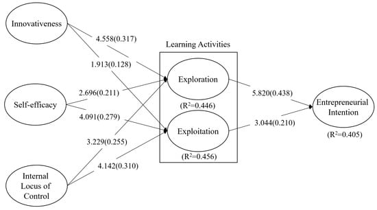 As Table 7 shows, the test results indicate that all hypotheses are supported. Exploration was significantly influenced by innovativeness (β = 0.075 t = 4.145, p < 0.05), self-efficacy (β = 0.068 t = 1.892, p < 0.058), and internal locus of control (β = 0.068 t = 4.127, p < 0.05), suggesting support for H1.1, H2.1, and H3.1. However, there was a lack of effect size on self-efficacy in exploration, so we concluded that the H2.1 is rejected. We can assume that even if the prospective entrepreneurs possess self-efficacy about new start-ups, exploration activities naturally do not confirm the outcomes. Thus, self-efficacy could not strongly relate to the exploration activities that require uncertainties and accidental findings. For exploitation activities, innovativeness (β = 0.080 t = 3.180, p < 0.05), self-efficacy (β = 0.070 t = 4.555, p < 0.05), and internal locus of control (β = 0.078 t = 2.707, p < 0.05) positively influenced exploitation, suggesting support for H1.2, H2.2, and H3.2. Finally, as mediators between personal traits and entrepreneurial intention, exploration (β = 0.068 t = 3.062, p < 0.05) and exploitation (β = 0.074 t = 5.929, p < 0.05) significantly influenced entrepreneurial intention, suggesting support for H4.1 and H4.2.