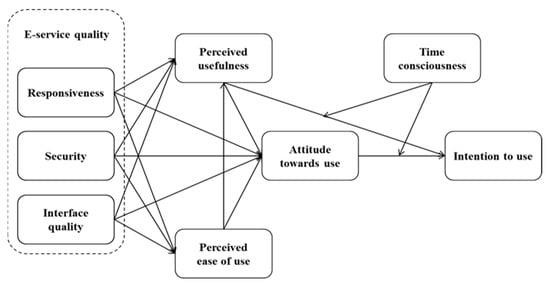 This study aimed to contribute to the literature by developing and validating a model that explains how key components of e-service quality affect consumer intention to use VTM services, with a specific focus on Vietnam. It particularly concentrates on three important e-service quality dimensions of interface quality, responsiveness, and security, which play an essential role in consumer decisions in e-banking services [,,,,]. It should be noted that previous research using the technology acceptance model (TAM) [] and the theory of planned behavior (TPB) [] reports that perceived usefulness (PU), perceived ease of use (PEOU), and attitude are important determinants of consumer intention to use e-banking services [,,,]. Hence, this study postulates that the three e-service quality factors (i.e., interface quality, responsiveness, and security) affect PU, PEOU, and attitude, which in turn motivate consumers to use VTM services. In addition, the study seeks to examine the moderating role of time-consciousness, given that the impact of PU and attitude on intention may vary across consumers with different levels of awareness of time and how they spend it []. Essentially, the objectives of this study are threefold: