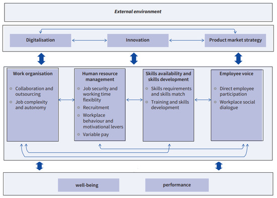 The dataset of the ECS 2019 [43] was collected from the period between January to July 2019. It includes information from HR managers and also employee representatives. The survey examines workplace practices, HR management, skills and strategies, and employee involvement, as well as digitalization, innovation and marketing strategies. Figure 1, which is adapted from [43], represents the conceptual framework of the data. In this research, the study is concerned with the following variables, i.e., collaboration and outsourcing, job complexity and autonomy, skill requirements and skill match, training and skill development, direct employee participation, indirect employee participation, innovation, digitalization, product market strategy, employee well-being, and firm performance. Table 1 lists the variables used in our analysis as well as the definitions that this study provides for them.
