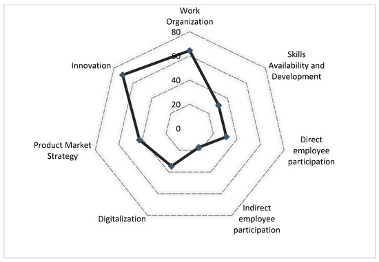 Considering the firms’ performance and the dominant role of work organization and innovation, the findings disclosed that the variables of collaboration and outsourcing, and innovation, were the most important both in determining the performance of firms and in improving the well-being of employees. On the other hand, it was found that workplace social dialogue (i.e., indirect participation) had the least impact on both performance and employee well-being. Examination of the studied variables at a higher level reveals that among the establishment characteristics factors, the work organization had the greatest impact on firm performance, and among the external environment variables, innovation had the greatest impact on firm performance. After the work organization variable, the skill availability and development variable and the employee voice variable were other establishment characteristics that played a role in determining firm performance. Innovation, product market strategy and digitalization were the external environment variables that were important in determining the performance of firms (see Figure 4). Although on average the employee voice was the least important in determining firm performance, a careful study of the variables of organizational characteristics shows that direct employee participation is among the most important and influential factors of organizational characteristics that affects performance. However, workplace social dialogue (i.e., indirect participation), or in other words, indirect employee participation, had the least impact on performance compared to the other variables studied, which led to a decrease in the average impact of employee voice on performance.