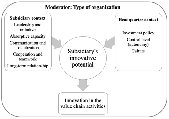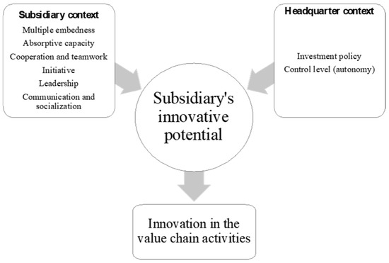 Behavioral contexts encompass autonomy, entrepreneurship and strategy. Autonomy relates to the degree to which subsidiaries can decide regardless of headquarters [13]. The role of subsidiaries in final decisions may vary according to an eventually conquered autonomy, which is positively related to the subsidiary’s ability to innovate. Greater autonomy provides subsidiaries with better adaptation to local market requirements [50]. Entrepreneurship is the capacity of subsidiaries required to promote innovation independently of headquarters. Particularly, subsidiaries demonstrate their entrepreneurship in business development initiatives [31]. A business development initiative is a proactive and deliberate search for new business opportunities by the subsidiary to expand its scope of responsibility in line with the headquarters strategy [12]. Subsidiary initiatives are expected to be proactive, autonomous and risk-taking, stemming from outside the home country, within a foreign subsidiary and under the leadership of the subsidiary´s actors. New knowledge can emerge due to a proactive initiative in searching for opportunities [51]. Eventually, this knowledge can be used to innovate, even by headquarters [52].