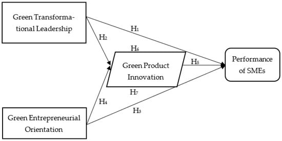 Green transformational leadership encourages employees to perform experimentation, which leads to green product innovation [57,58]. The literature on green innovation and performance is abundant [56]. However, a noteworthy point is that without the support of transformational leadership, employees cannot get involved in green product innovation, as it requires resources [45]. The deployment of resources leads to the superior performance of SMEs because of the cost-saving and environmentally friendly practices [34]. Green transformation leadership is beneficial because of its vision to promote green practices by recruiting employees who have the capability and environmental beliefs and values that are required for developing green products [43]. Green transformational leadership provides green training and development and considers compensation for getting involved in green practices as a core requirement to motivate their workforce for influential environmental benefits [28]. This enhances the market reputation of enterprises and, as a result, enterprises gain more clientele [7], which increases their revenues, and at the same time, because green product and process innovation costs are reduced, this creates a synergetic effect in boosting the overall performance of SMEs [59]. Green product and process innovation significantly offsets the negative influence of enterprises on the environment and improves their reputation and performance because of decreased costs, use of time, and other resources [51]. Based on the above discussion, we evaluated the following hypothesis:
