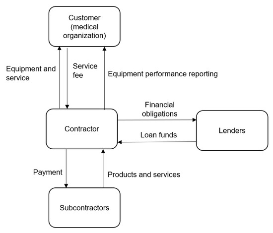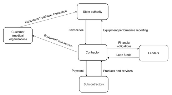Thus, taking into account and summing up the above, it can be noted that in this paper we will focus on LCCs provided to high-tech medical organizations—this is a form of interaction when all participants in the created product are responsible for their work area throughout the entire life cycle. Moreover, the return on investment and payment by the end user also occurs throughout the life cycle (useful life). In other words, the end user (in this context, the HMO) pays a subscription fee for the use of medical equipment and does not pay a one-time fee for it.