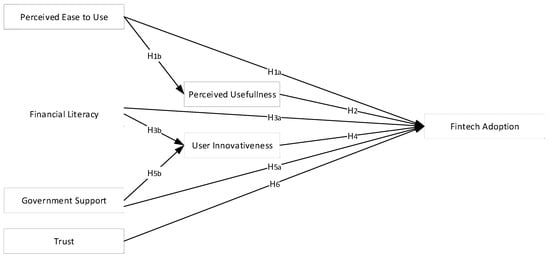 Even though TAM has been applied in many previous studies and has proven empirically reliable to examine technology adoption [17,18], Shachak et al. [19] documented that other dimensions need to be explored to provide a comprehensive perspective in adopting new technology. Therefore, several studies extend TAM with several new variables, such as technology anxiety and family support [19], social influence and perceived risk [20,21], and self-efficacy and perceived playfulness [22], to name a few. With reference to previous literature and recommendations from Fintech practitioners in Indonesia, this study incorporates several variables, including financial literacy, user innovativeness, government support, and trust, as additional dimensions of TAM (perceived usefulness and perceived ease of use).