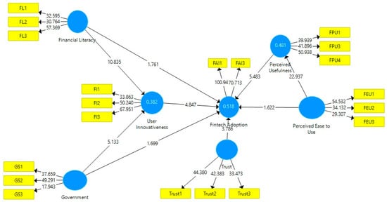 The study findings show that Fintech’s perceived usefulness directly impacts SMEs’ intention to use Fintech during the pandemic. These results are consistent with the technology acceptance model, which states that someone will consider technology from the view of technology usefulness in developing a business. These results align with previous studies [14,52,53]. Besides that, perceived ease of use [52,54], government support [4,55,56,57], trust [32,53], and user innovativeness [14,22,52,58] had a significant direct impact on SMEs’ Fintech adoption. Surprisingly, financial literacy did not directly impact Fintech adoption. Our findings show that financial literacy indirectly impacts Fintech adoption. These findings explained that external factors such as financial literacy do not directly affect Fintech user adoption. Still, financial literacy can greatly contribute to improving SMEs’ business with innovativeness from business actors.