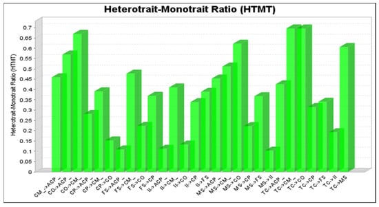 Several procedures were employed for the discriminant validity (Table 3) criterion. First, we used Fornell–Larcker’s [70] criterion. The result indicated that the square root of AVE was higher (italic and bold values at the top of the columns) than the correlation coefficients. Second, the heterotrait–monotrait ratio (HTMT) [73] was used to examine the discriminant validity. Figure 5 shows that all HTMT ratios of correlations are below 0.70, which is less than 0.85, and meets the discriminant validity criterion. According to Hair et al. [74], a factor with an HTML ratio of less than 0.85 has discriminant validity. Several scholars argued that the HTMT ratio must not exceed 0.90, or a minimum threshold of 0.85 [73].