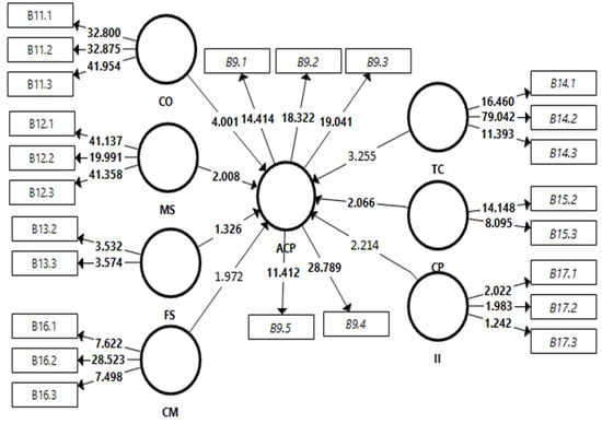 To assess data consistency, Dijkstra–Henseler’s rhoA was employed in the measurement of construct reliability. Dijkstra and Henseler [69] suggested that composite reliability (CR), Cronbach’s alpha (α), and rhoA are required to meet in the range between 0.70 and 0.95. Table 2 showed that all of these values attained their satisfactory levels, thus indicating that the measurement model has internal consistency. Convergent validity was achieved, as all the variables’ average variance extracted (AVE) was greater than 0.50 [70]. For the reliability of factor loading, Gudergan et al. [71] and Sarstedt et al. [72] suggested that loading higher than 0.70 is good but if AVE has not attained a satisfactory level, then the value between 0.40 and 0.70 may be dropped. The AVE value in this study was between 0.513 and 0.812, indicating that they meet the convergent validity criteria. The results of the measurement model are shown in Figure 4.