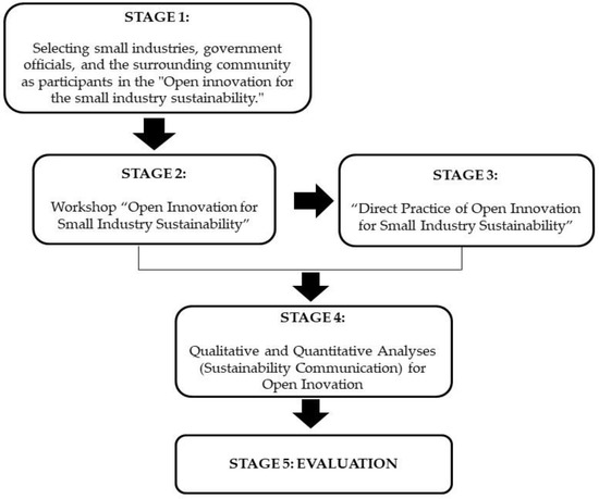 This research is divided into several stages (Figure 1). First was the selection of small industries to receive an open innovation design. The small industries were chosen by researchers based on the following criteria: those affected by the pandemic, recovered pioneering businesses after the pandemic, and motivated to achieve better performance. The research was conducted in four locations for small industries: Ciamis, Tasikmalaya, Garut, and Sumedang, West Java Province, Indonesia. Four small industries were selected based on the criteria: the cracker industry (traditional food typical of Ciamis made of cassava flour); the dodol industry (traditional food typical of Garut, wet cakes made of glutinous rice flour), the wicker industry (the typical Tasikmalaya wicker industry using pandan, bamboo, or mendong as the basic ingredients, the tofu industry (typical food from Sumedang, usually sold as fried tofu). The second was determining the activity participants, consisting of relevant government officials and the community around the industry. Twenty government officials and local communities were selected at each activity location with sufficient knowledge of small industries, making the total number of participants in the workshop 160. Third, the main data collection was obtained from the activities, workshops, or providing materials in formal classes and hands-on practice classes. The fourth was document analysis and observation, followed by an evaluation of the application of open innovation (Table 1). Evaluation is carried out by conducting interviews and direct observation related to the implementation of open innovation in small industries, analyzing how far the design innovation has been applied to achieve the expected goals.