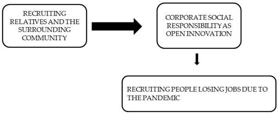 After the COVID-19 pandemic, small industries designed open innovation to improve their social performance by recruiting several people who were unemployed due to the pandemic (Figure 4). The impact of the pandemic has brought severe consequences in Indonesia, one of which is increasing the number of jobless people experiencing unilateral termination.