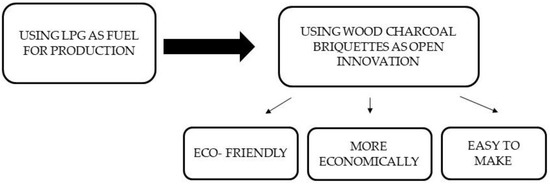This condition declined their financial performance. One alternative to open innovation carried out by the tofu industry is to design the use of briquettes as an eco-innovation fuel solution (Figure 5). In addition to being environmentally friendly, these briquettes are more efficient and economical than other fuels, such as LPG. It is also more profitable (Table 9). Briquettes are cube-shaped and sometimes have cavities for easy placement in the stove and packing. The types of briquettes widely used are charcoal briquettes and coconut shell briquettes. This briquette is one of the most popular briquettes for cooking. In addition to the affordable price, cooking using charcoal briquettes is believed to enhance the taste of food.