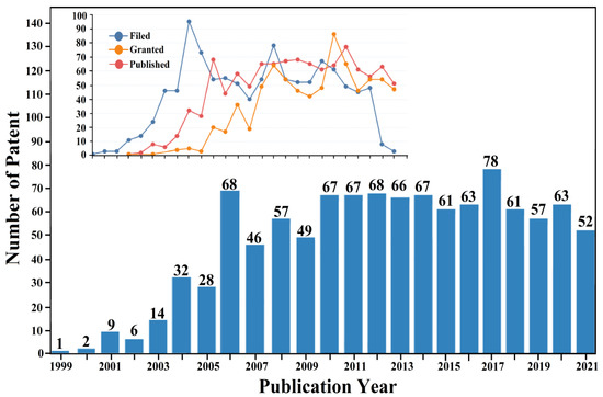 Number of patents generated by UoC in the time period 1999–2021. The inset shows the number of filed, granted and published patents.