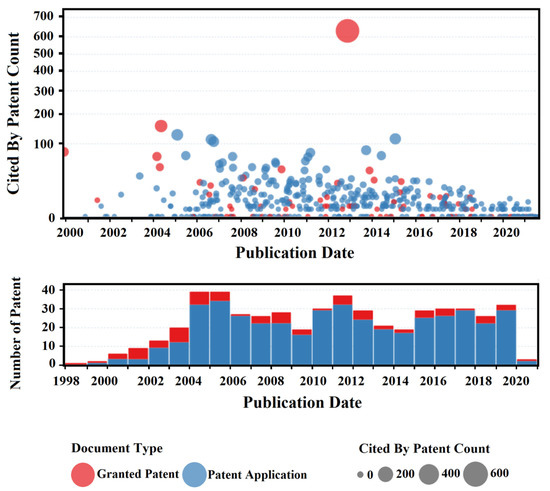 Patent scatter plot sorted by forward patent citations, based on the publication date.
