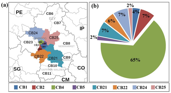 (a) Map of Silicon Fen, indicated by postcodes starting with CB. The coloured section in the figure shows different districts within which there are companies with at least one joint patent with UoC. (b) The percentage of joint patents based on the district.