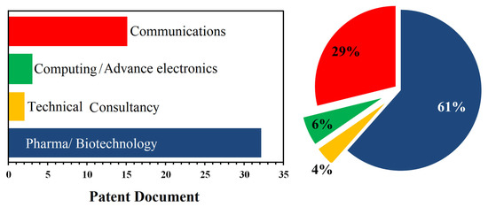 The field of invention highlights the corresponding technological sector. Therefore, the analysis of patent fields can provide a powerful tool for tracking technological developments [78]. Figure 3 shows the invention fields of all patents/patent applications generated by UoC in the time period 1999–2021. There are 23 invention fields in the Derwent Innovation index, and for simplicity, only the top ten invention areas are presented, covering the vast majority of the patents/patent applications owned by UoC. These fields include Engineering (550 documents), Chemistry (524 documents), Instruments/Instrumentation (469 documents), Pharmacology/Pharmacy (310 Documents), Biotechnology/Applied Microbiology (285 documents), Polymers Science (190 documents), Electrochemistry (151 documents), Materials Science (148), Computer Science (105) and Imaging Science/Photographic Technology (95). It should be noted that a patent might involve more than one invention area, which justifies the total number of documents per area of the sector to be higher than the number of total documents.