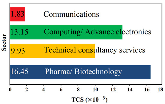 Figure 7 shows the number of joint patents generated by UoC and SF companies based on the sector of companies. It can be seen that during the time period from 1999 to 2021, the majority of joint patents (61%) belong to the Pharma/Biotech sector of SF, while the Communications sector accommodates only 29% of the total joint patents. Values of TCS associated with the technological collaboration between UoC and SF firms, as the function of the sector of firms, are presented in Figure 8. As can be seen, the Pharma/Biotech sector of SF has the highest TCS value of 16.45 × 10−3, followed by Computing/Advance Electronics (13.5 × 10−3). From the results obtained, the H1 hypothesis of this study is confirmed, based on which the Pharma/Biotech sector of SF has the greatest technological collaboration strength with UoC.