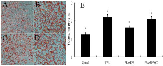 Human HepG2 hepatocytes were cultured and treated previously described []. Briefly, human hepatoma-derived HepG2 cells were maintained in low glucose-containing Dulbecco’s modied Eagle’s medium. After reaching 75% confluence, the cells were serum-starved for 16 h and then exposed to FFA (free fatty acids) to induce fat overloading. The cells were treated with EPF (10–100 g/mL) or FFA (0.25–2 mM). Cellular triglyceride (TG) was detected with related kits as manufacturer’s instructions (Nanjing Jiancheng Bioengineering Institute, Nanjing, China).