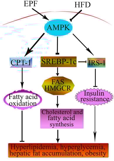 AMPK can mediate lipid metabolism in livers by regulating the expression levels its target genes SREBP-1c, FAS, ACC and HMGCR [,,]. Previous report showed that AMPK coordinates the long-term adaptation of lipid metabolism by regulating the transcriptional factor SREBP-1c (a key transcription factor involved in the control of cholesterol and fatty acid synthesis), which further increase the transcription of FAS and SCD-1, resulting in an increase in the synthesis of TG [,,,]. Several studies have demonstrated that the flavonoid extracted from plants could inhibit lipid-related metabolic disorders by regulating the expression levels of AMPK and SREBP-1c and their target genes [,,,]. As demonstrated in our Western blot analysis, EPF supplementation significantly down-regulated the expression levels of AMPK and SREBP-1c and their target gene HMGCR, an endoplasmic reticulum bound and peroxisomal enzyme that is the rate-limiting step in cholesterol biosynthesis, suggesting that EPF had a positive effect due to the lower expression of HMGCR and contributed to inhibit the serum cholesterol increase due to high fat diet (Figure 5). Moreover, EPF treatment significantly down-regulated the expression level of FAS, a key enzymes involved in lipogenesis and up-regulated the expression level of carnitine palmitoil transferase 1 (CPT1), which catalyzes the entrance of fatty acids into the mitochondria and it is the rate limiting enzyme of hepatic fatty acid β-oxidation (Figure 5). Therefore, these results implied that the reduced biosynthesis and enhanced fatty acid oxidation might contribute to the beneficial effects of EPF on hyperlipidemia and hepatic lipid accumulation in the HFD mice. These data explained the anti-obesity, hypolipidemic and hypoglycemic effects of EPF to a certain extent.