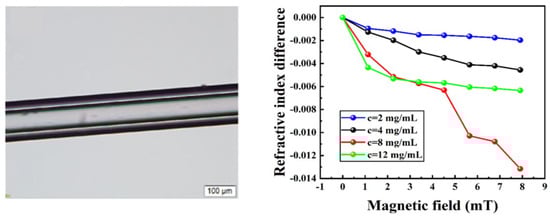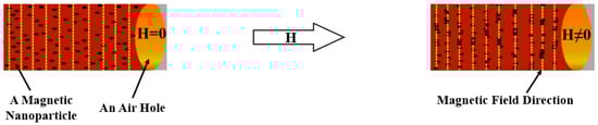 Some research results provided by Azad et al. [] indicated that magnetic nanoparticles, which are the efficient composition of MF, will gather and rearrange orderly in the direction parallel with the magnetic field, resulting in the generation of so-called Magnet Chains and the alternation of the refractive index, as shown in Figure 1.