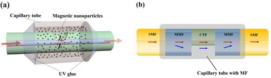 Magnetic field fiber sensors based on (a) MI (reprinted with permission from Ref. [], 2021, The Optical Society) and (b) SI (reprinted with permission from Ref. [], 2022, The Optical Society).