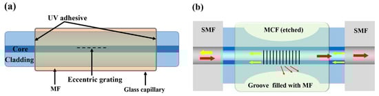 Besides the fast and slow axis’s ERI, directly exploiting a particular FG with an asymmetrical structure is also feasible. For instance, Zhang et al. [] employed a femtosecond laser to write gratings, and proposed a sensor based on Eccentric Fiber Bragg Grating (EFBG) (Figure 6a). Forward-coupling modes reflected by the gratings interact with MF, which manifest various properties under different magnetic field intensities and directions. Bao et al. [] wrote gratings on both fiber core and cladding and employed HF to reduce the fiber size, raising the coupling efficiency of the fiber Evanescent Field to MF (Figure 6b). The proposed sensor with a Multi-Claddings Fiber (MCF) has a good response to magnetic field intensity, direction and the environment temperature.