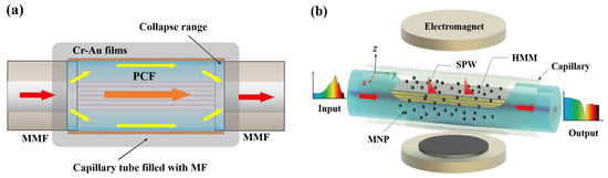 Magnetic field fiber sensors based on SPR with (a) MMF-PCF-MMF structure [] and (b) HMMs (reprinted with permission from Ref. [], 2022, Springer Nature).