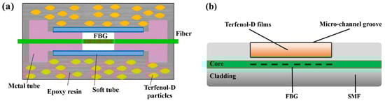 The wrapped type is another common magneto-strictive transducer, and it is made of a sensing fiber wrapped with magneto-strictive powders. Peng et al. [] made a composite material with Terfenol-D powders mixing glue and proposed a sensor with a sensitivity-enhancement structure (Figure 11a). Under a magnetic field, this structure will concentrate the sensor’s stress. Under a magnetic field, this structure will concentrate the sensor’s stress, raising the sensor sensitivity to 0.983 pm/Oe. Zhang et al. [] also proposed a sensor with a similar structure, which enhanced the sensor sensitivity by 5.17 times. A research result in earlier years provided by Quintero et al. [] indicated that sensor sensitivity is impacted by the glues’ category and magneto-strictive powders’ density, and sensor sensitivity can be further improved by imposing some prestress.