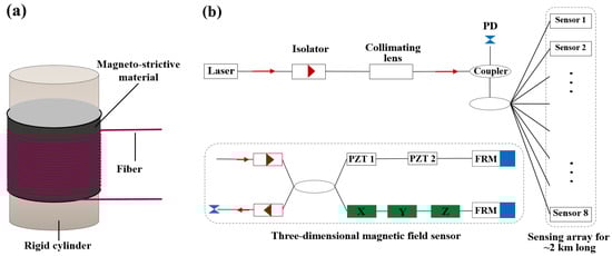 Accompanied by the continuous development of fiber-sensing technology in past decades, magnetic field fiber sensors have been becoming more and more prominent because of their compact structure, superior performance, and strong environmental adaptability, and they can even detect an extremely weak magnetic field down to the fT−level (1 fT = 10−15 T) []. Compared with single-point-type magnetic field sensors, such as fluxgate [], giant magnetoresistance [], and Superconducting Quantum Interferometer Device (SQUID) [], magnetic field fiber sensors support quasi-distributed/distributed sensing, and can be applied in a dragnet-type search for a large-scale region to improve the capture probability of magnetic anomaly targets [].