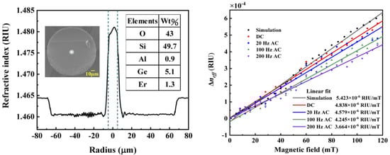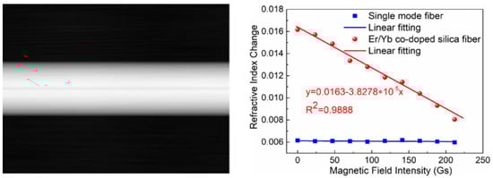 Er is a rare-earth element with a large spin magnetic moments and a high transition energy level. Er3+ has a large number of unpaired electrons at the 4f energy level. These unpaired electrons can transition and split, resulting in Er3+ having good magnetic properties []. Liu et al. [] introduced an Er-doped fiber with 1.3 wt% EDF into MZI to fabricate a sensor based on ASMMs, with the highest sensitivity being 4.838 × 10−7 RIU/Oe (Figure 14). However, the environmental temperature will change the bond length and angle between atoms in Er-doped fiber, resulting in a refractive index change []. Therefore, Er-doped fiber sensors have issues of high cross-sensitivity and serious temperature crosstalk, similar to MF. Accordingly, some measures related to temperature compensation and shield should be considered during sensor fabrication.