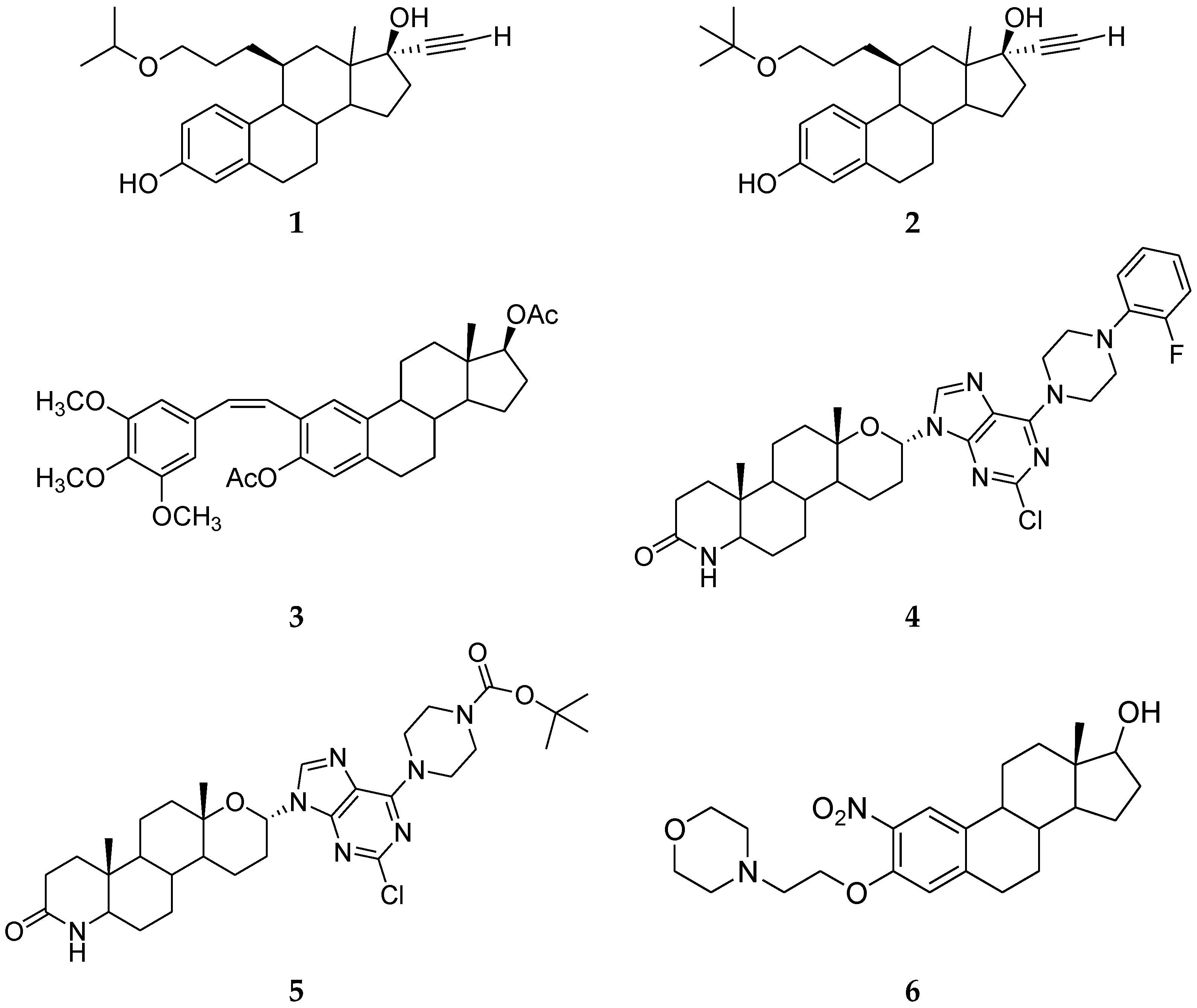 Zhang et al. reported a new series of 11β-ether-17α-ethinyl-3,17ß-estradiol that demonstrates strong ER antagonist activity. The ethers were particularly interesting as they were highly active anti-estrogens that were more stable than other substituents. Among these ethers, compounds 1 and 2 (Figure 1) bind very strongly to both ERα and ERβ [16].