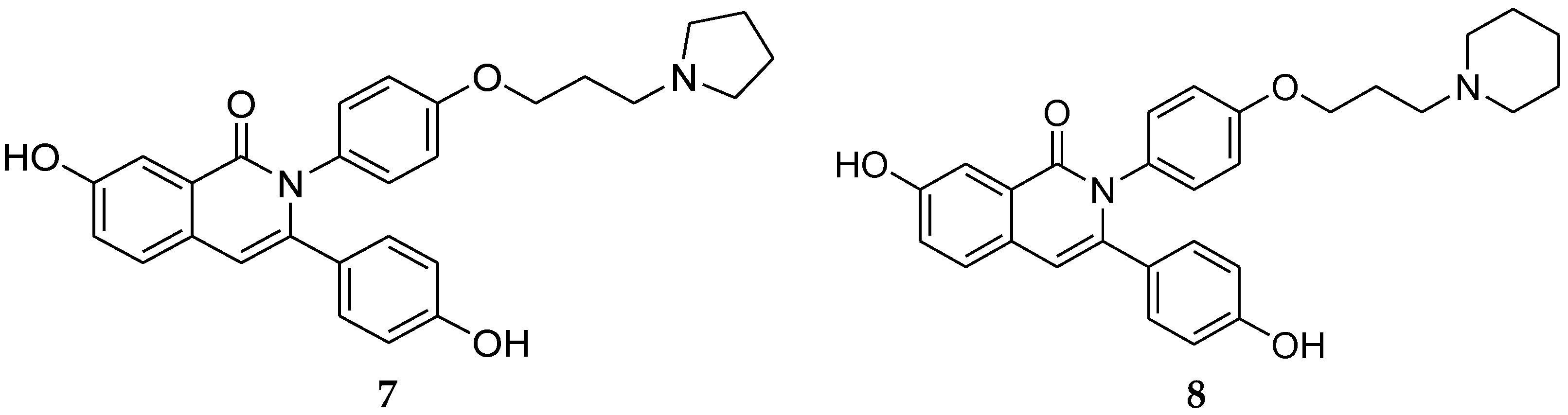 A new series of 2,3-diaryl isoquinolinone derivatives were reported as anti-breast cancer agents targeting ERα and vascular endothelial growth factor receptor 2 (VEGFR-2). ERα is responsible for estrogen-induced proliferation in breast cancer in which angiogenesis plays an important role in both local tumor growth and distant metastasis in many cancers [30]. Therefore, Tang et al. [31] reported a new series of compounds with characteristics of both selective estrogen receptor modulators and VEGFR-2 inhibitors. It was anticipated for these compounds with dual targets to gain more efficiency as anti-breast cancer agents with fewer side effects. VEGFR-2 inhibitors possessing an indol-2-one scaffold, such as sunitinib and YM231146, bear some structural similarities with SERMs (Figure 2). All compounds possess an aromatic scaffold and flexible side chain with a tertiary amine substituent on the end. Based upon that, 2,3-diaryl isoquinolinone derivatives were synthesized and evaluated. Among these series, compounds 7 and 8 (Figure 3) had the best affinity for ERα and the inhibition rates were as potent as tamoxifen. The results of a VEGFR-2 kinase inhibition assay showed that these derivatives had moderate-to-strong inhibitory activities compared with sunitinib. Compound 8 showed the best results for both ERα and VEGFR-2 kinase inhibition.
