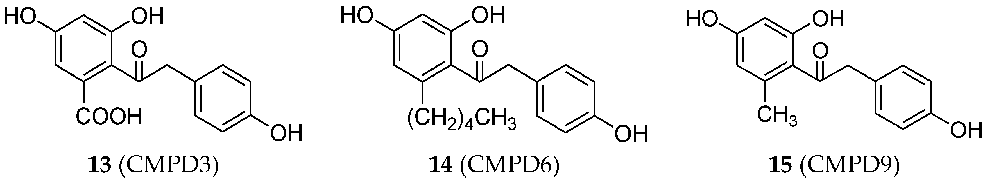 Estrogenic effects of three substituted deoxybenzoins were reported by Chandrasekharan et al. [40]. These compounds were designed as CMPD3 (13, Figure 5), CMPD6 (14, Figure 5), and CMPD9 (15, Figure 5) which possess –COOH, –(CH2)4–CH3, and –CH3 substitutions, respectively, on the 2′ position of the 2,4-dihydroxyphenyl ring of deoxybenzoin. Results showed that all three compounds increased the proliferation of the MCF-7 cell line and showed similar affinity for both ERα and ERβ receptors.