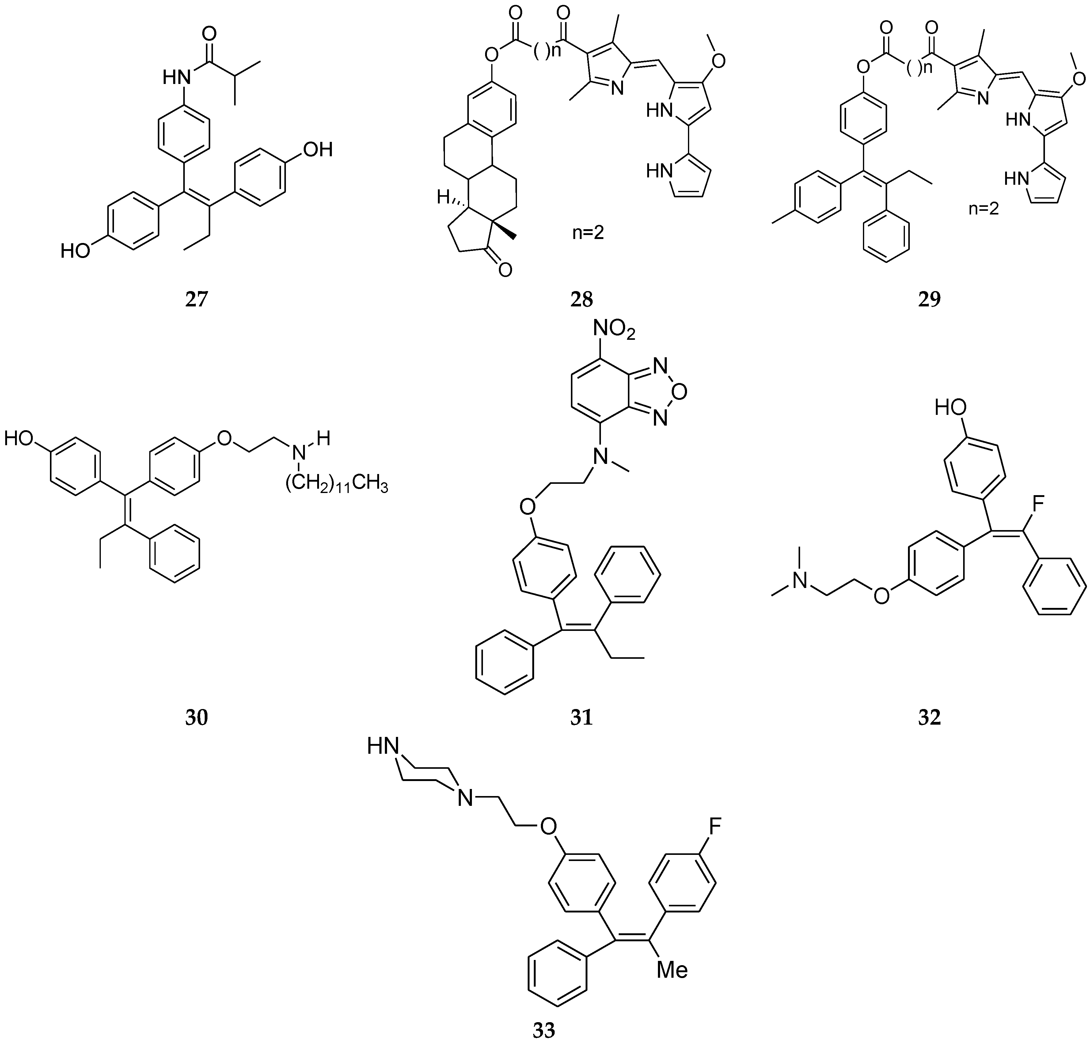 A new series of novel tamoxifene analogues were evaluated for their anti-proliferative activity on breast cancer (MCF-7) and their activity was comparable or even higher than tamoxifen. These derivatives maintained the triarylethylene skeleton of tamoxifen having OH groups at the para position of the phenyl rings of tamoxifen and substituted the side chain of tamoxifen with an amide side chain. One of the most active compounds in this series, such as 27 (Figure 11), had anti-proliferative activity about four times higher than tamoxifen [51].