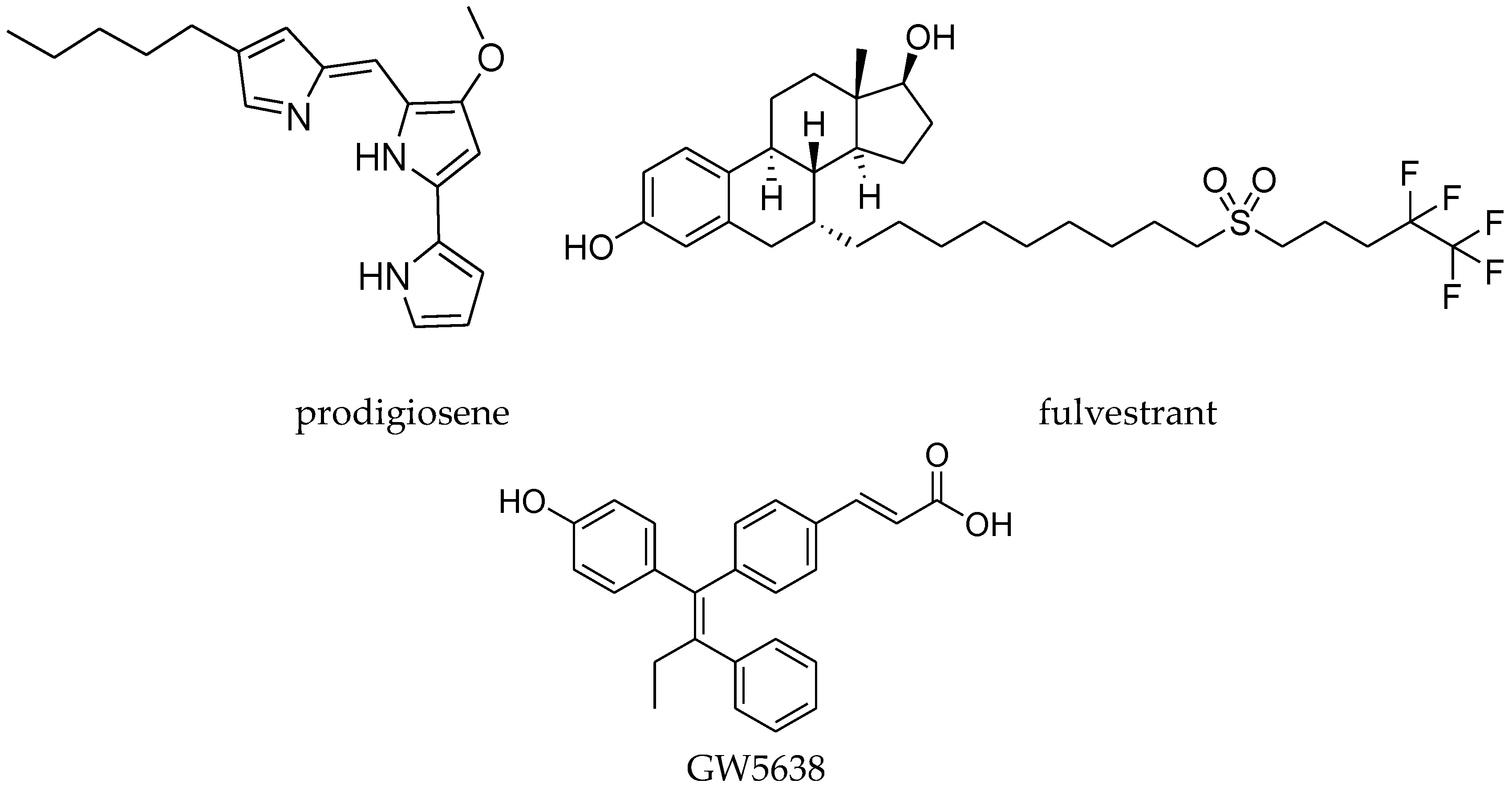 - Hawco, C.L.A.; Marchal, E.; Uddin, M.I.; Baker, A.E.G.; Corkery, D.P.; Dellaire, G.; Thompson, A. Synthesis and biological evaluation of prodigiosene conjugates of porphyrin, estrone and 4-hydroxytamoxifen. Bioorg. Med. Chem. 2013, 21, 5995–6002. [Google Scholar] [CrossRef] [PubMed]