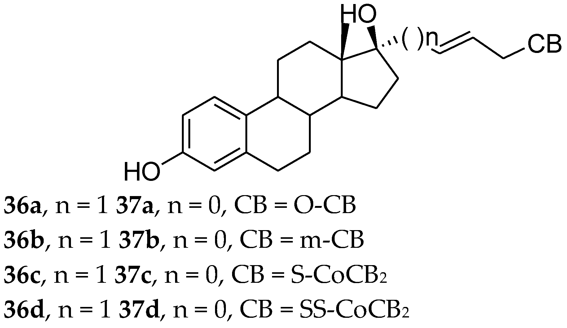 Carboranes are man-made compounds that have no counterparts in nature. Their unique bonding, structure, and properties predetermine them to be used and tested in many applications. During the last decade it has been shown that 17α-substituted arylestradiol sharing a lipophilic aromatic moiety displayed high affinity for binding to ERα and ERβ receptors [61,77,78,79,80,81,82,83]. As a result, Sedlak et al. [84] reported a new series of 17α-(carboranylalkyl)estradiols as ligands for estrogen receptors α and β. Results showed that all of the tested compounds (Figure 14) had estrogenic activity, although none of them were able to fully activate either ER like 17β-estradiol. Relative transcription activity (RTA) is shown in Table 1. Results also showed that compound 37a is 30 times more selective for ERα than ERβ and it is the most potent ligand for ERα among the tested compounds. They also showed that the length and the position of the double bond in the alkenyl linker are important for the affinity of the ligand to the receptor. Smaller carborane groups require shorter linkers to efficiently activate ERs.