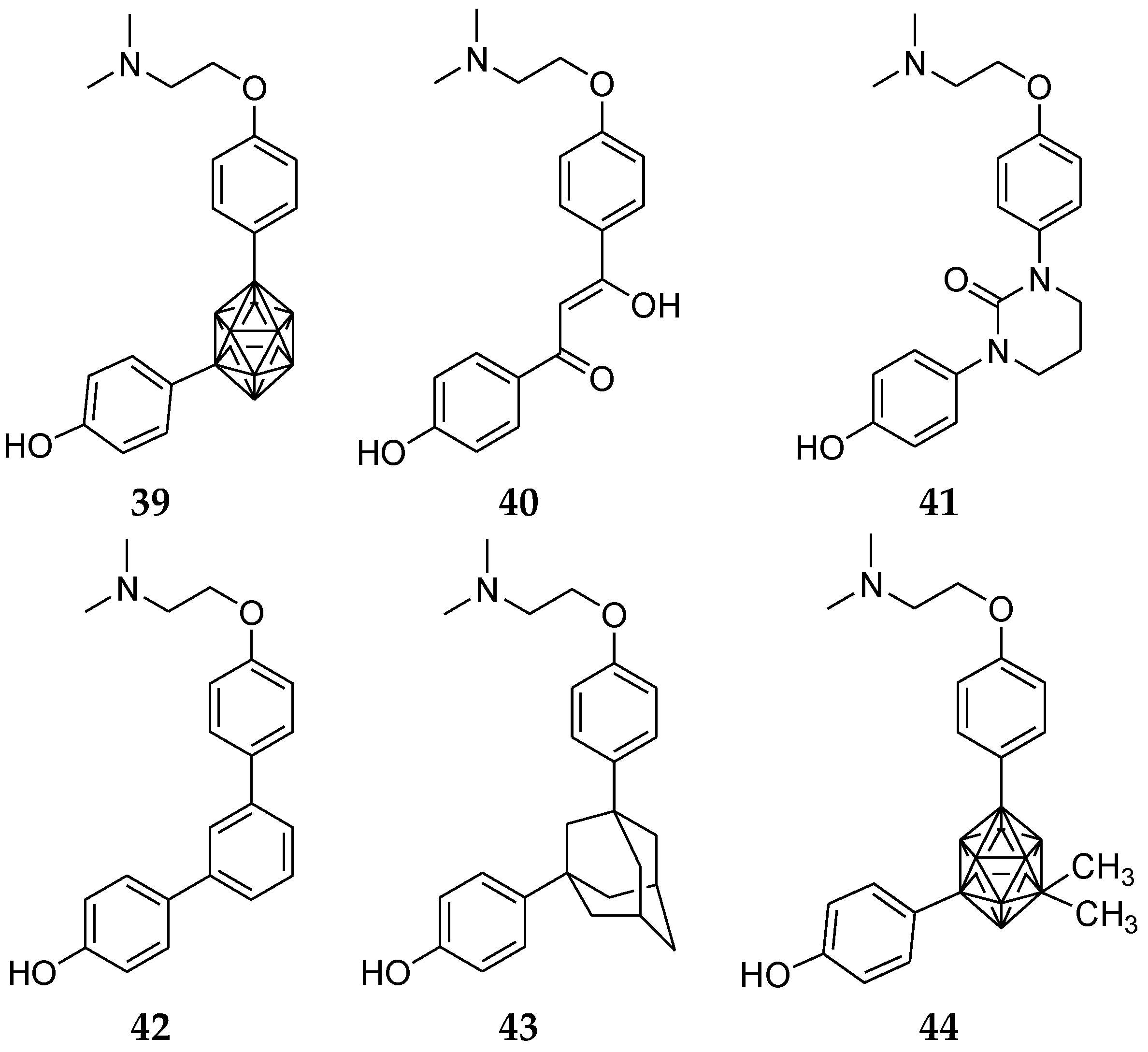 Ogawa et al. [86] designed and synthesized novel estrogen receptor modulators containing various hydrophobic bent-core structures. Previously discovered m-carborane derivative (39, Figure 16) displayed ER partial agonistic activity in ERα trans activation assays. In this series, compounds with pseudo cyclic, tetrahydropyrimidinone, m-benzene, adamantine, and 9,10-dimethyl-m-carborane were synthesized. Among them, compound 44 with a 9,10-dimethyl-m-carborane cage showed a greater ER-binding affinity than compound 39 with two methyl groups into the m-carborane cage. Compound 39 had an increase of Hansch hydrophobic value (π value) [87,88].