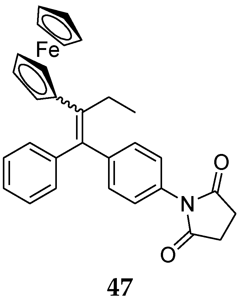 Recently, new ferrocenyl compounds with different alkyl chain lengths were synthesized and evaluated against hormone-dependent breast cancer cells. Seven new ferrocenyl compounds having different chain lengths (suberic, adipic, succinic) were synthesized and all of them displayed strong anti-proliferative activity against hormone-dependent and independent breast cancer cell lines. Interestingly, among this series, compound 47, having a succinimide group (Figure 18), was the most active compound against hormone-dependent MCF-7 breast cancer cells, presumably owing to an antagonist effect on ERα [94].