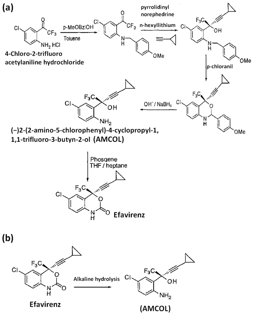 Schematic reaction mechanism showing the formation of (a) (2S)-(2-Amino-5-chlorophenyl)-4-cyclopropyl-1,1,1-trifluoro-3-butyn-2-ol (AMCOL) during the synthesis of efavirenz and (b) degradation of efavirenz to AMCOL.
