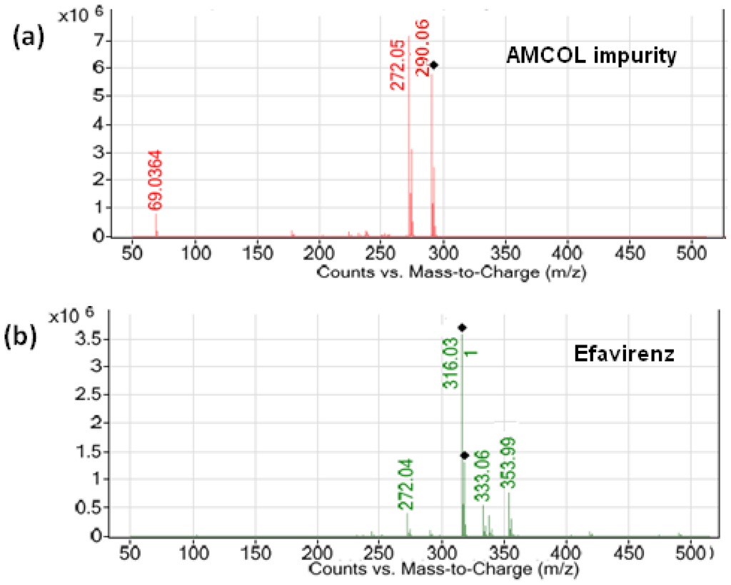 Typical mass spectrum scans of the (a) AMCOL impurity and (b) efavirenz.